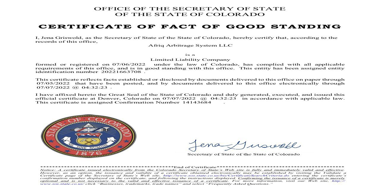 Also, it displays a ‘certificate of good standing’ on its website, which it claims to have gotten from the office of the Secretary of State, Colorado.