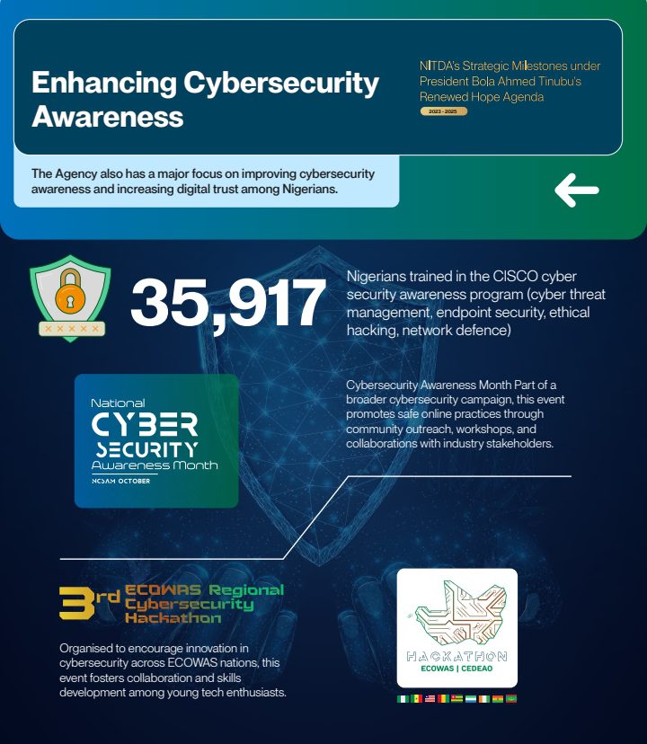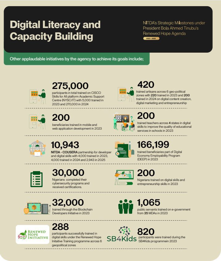 Continuing, the National Information Technology Development Agency (NITDA) championed digital literacy. DL4ALL, rolled out in May 2025, targeted 70% literacy by 2027.