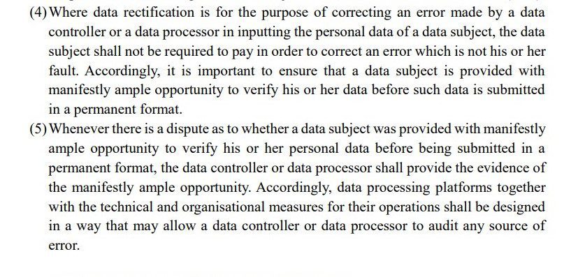 “Where data rectification is for the purpose of correcting an error made by a data controller or a data processor in inputting the personal data of a data subject, the data subject shall not be required to pay in order to correct an error which is not his or her fault. Accordingly, it is important to ensure that a data subject is provided with manifestly ample opportunity to verify his or her data before such data is submitted in a permanent format,” it reads.